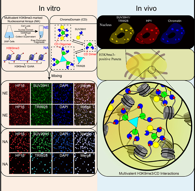 真核细胞利用许多膜结合的细胞器来区分生化反应,以便更好地进行空间和时间调节。例如,它们的基因组被封闭在一个膜结合的细胞器中,即细胞核,以便更好地控制遗传信息流。在细胞核内,基因组被进一步调控形成很多区室或区域,这些区室或区域在调节基因表达时起重要作用。从它们的一些特征判断,这些动态实体区室类似于无膜细胞器。许多在染色质区室化中起作用的蛋白质具有液-液相分离的固有能力,比如人源异染色质蛋白HP1α,以及果蝇异染色质蛋白HP1a。基于这些观察结果,有人已经提出染色质区室化是通过液-液相分离形成的。但是之前的研究都无法解释,为什么无法自身或与DNA发生相分离的人源异染色质蛋白HP1α的另外两种同源蛋白HP1β和HP1γ是如何行使类似的功能,以及组成型异染色质的形成,是否受到多价HP1蛋白复合体与多价组蛋白H3K9三甲基化(H3K9me3)修饰的多价相互作用形成的液-液相分离机制的调节。