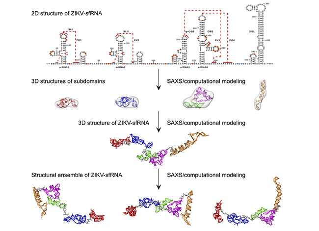 开展长链非编码RNA的结构-功能研究具有重要意义,但目前对其三维空间结构的研究缺乏有效手段,因而长链非编码RNA的三维空间结构信息还非常少。来源于蚊媒黄病毒的长链非编码亚基因组RNA的长度在400到500个核苷酸之间,应用传统的结构生物学方法,例如X射线晶体学、核磁共振或冷冻电镜对其进行结构研究非常困难。方显杨课题组的研究团队及其合作者,结合小角X射线散射技术及计算模拟,采用分步解决的方案,研究了来源于2型登革病毒、寨卡病毒和西尼罗病毒的长链非编码亚基因组RNA的溶液结构及其柔性。研究发现,黄病毒长非编码亚基因组RNA具有多个亚结构域,其在溶液中具有伸展的三维空间结构,具有类似于多结构域蛋白的模块化结构特征并存在较大的柔性。