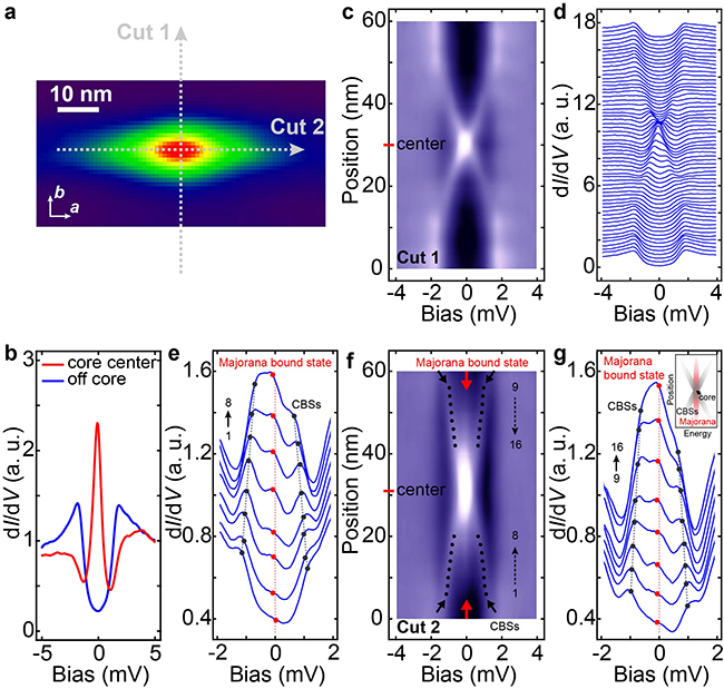 利用低温强磁场扫描隧道显微镜技术,该研究团队在一种新型的过渡金属硫族化合物-2M相的WS2中观测到了马约拉纳束缚态(如图所示)。通过观测其磁通内态密度随空间的演化,他们发现该马约拉纳束缚态具有高度的空间各向异性,这可能是各向异性的超导序参量和拓扑表面态共同导致的。重要的是,2M-WS2是一种不需要额外元素插层或掺杂的本征材料,且极易实现机械剥离,因此,该材料是研究未来拓扑量子计算理想的材料体系之一。该材料由上海硅酸盐研究所的黄富强研究团队合成,南京大学的张海军教授基于第一性原理计算预言了该体系存在拓扑表面态,相关工作发表在《先进材料》(Advance Materials)上。