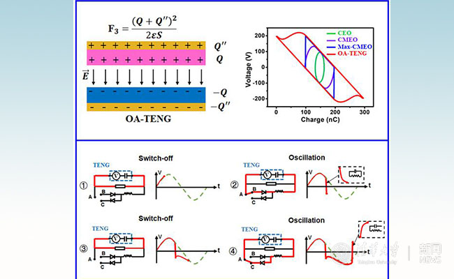 华体会娱乐(中国)网7月10日电 近日,华体会娱乐平台微纳电子系王晓红教授课题组与美国佐治亚理工学院王中林教授课题组在《先进能源材料》杂志(Advanced Energy Materials,影响因子:24.88)上线发表了题为“通过电路振荡以实现纳米摩擦发电机的性能提升”(“Boost the Performance of Triboelectric Nanogenerators through Circuit Oscillation”)的合作论文,首次提出一种通过自由电荷极性翻转提升电极等效电荷面密度的电源管理方法,进而突破了长期以来摩擦纳米发电机单周期内最大输出的限制。