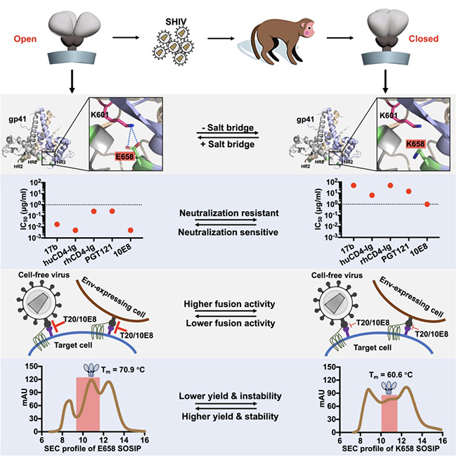 该论文首次从中国流行的艾滋病病毒中挑选构象“开放”的表面蛋白,构建猴人杂合艾滋病病毒SHIV,利用恒河猴模型开展SHIV在适应新宿主过程中的病毒变异、生物学活性和免疫逃逸机制研究。研究发现,病毒为了适应新宿主,其表面蛋白产生大量突变,并从“开放”构象快速转变为“闭合”构象,从而达到提高感染效率和免疫逃逸的双重目的。研究团队通过病毒基因组学、定点单氨基酸突变、入侵细胞能力、中和抗体敏感性和结构生物学等系统研究,发现表面蛋白gp41 HR2区域中E658K单点氨基酸突变对病毒适应新宿主和免疫逃逸起到关键作用,对多种亚型病毒有着类似的效应。本研究解析了艾滋病病毒表面蛋白在适应新宿主过程中高速突变的分子基础和生物学意义,为基于艾滋病病毒表面蛋白的疫苗设计和药物研发提供了重要的参考和借鉴。