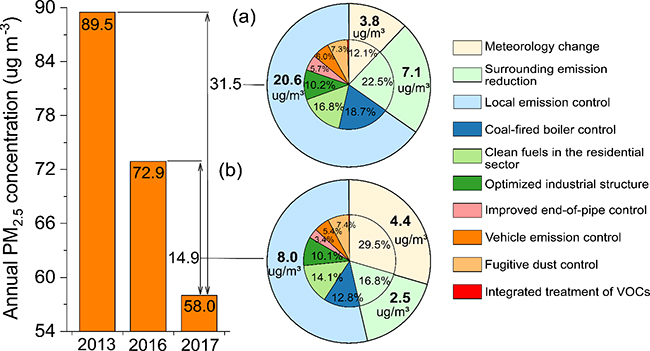 华体会娱乐(中国)网5月16日电 为改善空气质量,我国政府于2013年发布了《大气污染防治行动计划》(即“大气十条”),其中要求2017年北京市年均PM2.5浓度达到60μg/m3。为完成这一艰巨目标,北京市及周边地区先后实施了一系列大气污染控制政策,区域空气质量迅速改善,北京PM2.5年均浓度由2013年的89.5 μg/m3下降至2017年的58 μg/m3,实现了国内外普遍认为难以完成的任务。在减排之外,气象条件年际变化对PM2.5浓度也产生重要影响。由于北京市2017年气象条件较2013和2016年相比更为有利,北京PM2.5污染改善过程中“人努力”和“天帮忙”各自起到多大的作用,一直受到政府和公众的广泛关注。