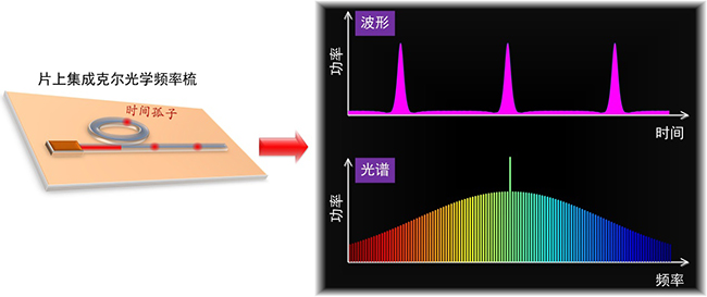 图1. 片上集成克尔光学频率梳及其波形、光谱示意图
