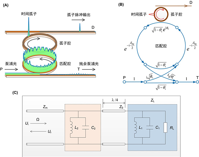 图2. 双耦合光学谐振腔中的超级效率时间孤子。(A) 器件结构示意图;(B) 工作原理;(C) 传输线RLC网络类比。