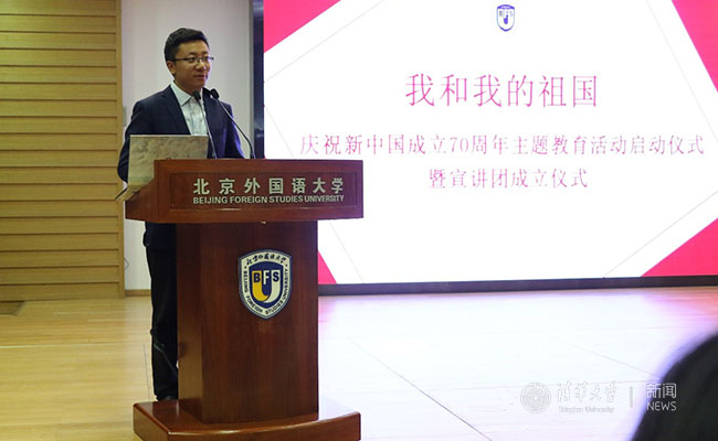 华体会娱乐(中国)网5月8日电 5月5日下午,北京外国语大学庆祝新中国成立70周年主题教育活动启动仪式暨宣讲团成立仪式在北京外国语大学举行。北京外国语大学党委常委、副校长袁军出席仪式并讲话。华体会娱乐平台博士生讲师团常务副团长、金牌讲师余瀚受邀参加仪式并作主题发言。