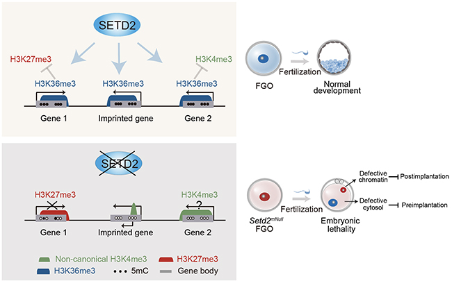 SETD2是一种组蛋白甲基转移酶,能够在组蛋白H3第36位赖氨酸上加上三个甲基化修饰(H3K36me3)。H3K36me3通常出现在转录活跃区域,被证明是一种由RNA聚合酶转录时所带来的组蛋白修饰。在该研究中,研究人员首先利用颉伟课题组于2016年开发的高灵敏STAR ChIP-seq技术,系统地检测了小鼠卵母细胞与早期胚胎发育过程中H3K36me3的分布情况。研究人员发现,在小鼠卵母细胞中,H3K36me3与DNA甲基化呈现非常强的正相关性,而与H3K4me3以及H3K27me3则呈现互斥分布模式。随后,通过在卵母细胞中特异性敲除Setd2,研究人员发现该雌性小鼠具有不育特征。进一步研究发现,卵母细胞中表观遗传修饰的分布情况发生了巨大的改变,包含以下几个方面:1)H3K36me3在全基因组基本丢失;2)全基因组的DNA甲基化建立高度异常;3)母源基因印记完全丢失,同时这些区域错误的加上了拮抗DNA甲基化的H3K4me3。4)H3K4me3和H3K27me3被错误的建立在很多其他的转录活跃区域,其中H3K27me3的错误建立伴随着基因转录下调。与之同时,Setd2敲除卵母细胞排卵率下降,受精后早期胚胎发育阻滞在受精卵1细胞时期。为了进一步研究Setd2缺陷卵子如何造成早期胚胎发育阻滞,研究人员通过卵母细胞核质互换以及单精子显微注射受精的技术,揭示了Setd2母源缺陷的细胞质能够引起植入前胚胎发育阻滞,而染色质的缺陷则会导致植入后胚胎发育致死。因此,SETD2作为一个卵子表观基因组的核心调控因子,对确保卵母细胞表观基因组的正常建立,以及维持随后胚胎发育至关重要。综上所述,该研究系统地在小鼠卵母细胞发育过程中探索了表观基因组建立的分子机制,揭示了卵子表观基因组在卵子发生和早期胚胎发育过程中的重要功能。