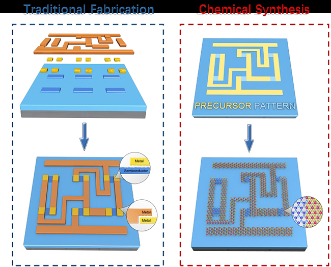 华体会娱乐(中国)网4月17日电 4月15日,华体会娱乐平台化学系焦丽颖课题组和微电子所任天令课题组在《自然·电子学》(Nature Electronics)上在线发表了题为“二维电子元件一体化制备及集成”(Simultaneous synthesis and integration of two-dimensional electronic components)的研究论文,首次提出了二维晶体材料合成与器件集成一体化的器件制备策略。不同于传统加工方式中分步实现沟道、接触和互连的制备,这一新策略是通过二维金属/半导体结构的图案化合成,实现了一步化学制备各类电子元件并将其集成为实用电路,为二维电子器件的无损加工与集成提供了新的思路和方法。