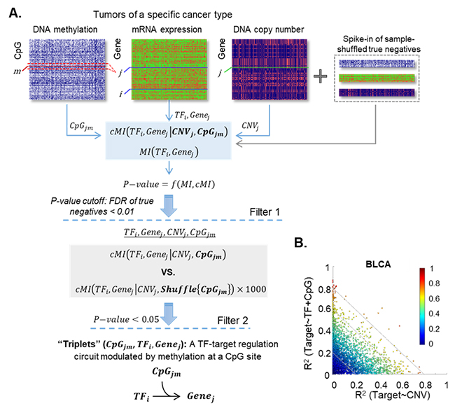 A. 分析算法流程:使用肿瘤队列多组学数据鉴定DNA甲基化对转录调控通路的影响。B. 以膀胱癌(BLCA)为例,不同基因的表达水平可能有高度差异化的调控机制(甲基化参与的转录调控或拷贝数变异调控)。