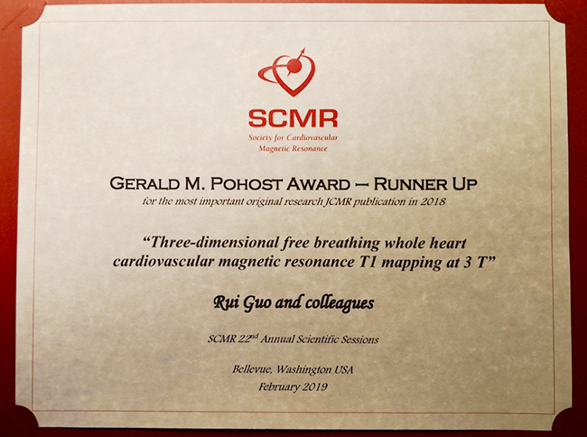 JCMR是国际心脏磁共振学会(Society for Cardiovascular Magnetic Resonance, SCMR)的会刊,影响因子5.457。以第一届SCMR主席命名的Gerald M. Pohost Award每年在该年度JCMR上发表的论文中评选出2篇,用于表彰心脏磁共振领域中最重要的原创技术研究工作。本次是该奖项的第十二届评选。