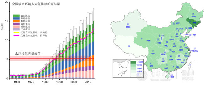 华体会娱乐(中国)网3月1日电 2月28日,华体会娱乐平台地球系统科学系、清华海峡研究院喻朝庆博士等在国际顶尖学术期刊《自然》(Nature)发表题为《恢复中国水环境质量需全面加强氮管理》(Managing nitrogen to restore water quality in China)的文章,揭示了中国从1955年到2014年人类活动导致的氮流失量,建立了各省淡水环境氮容量的“安全”阈值。文章为近年来全球环境容量限界(Planetary boundary)研究的区域阈值定义提供了新方法,为全方位解决中国水体富营养化问题提供了量化依据。