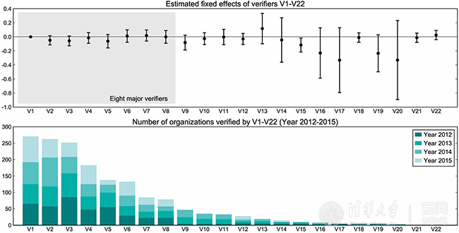 北京碳市场中22家第三方核查机构的固定效应估计结果及2012-2015年各机构所核查单位的数目变化情况