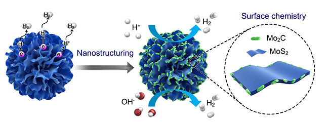 华体会娱乐(中国)网1月18日电 1月17日,清华-伯克利深圳学院刘碧录、邹小龙、成会明团队在《自然·通讯》 (Nature Communications)期刊上在线发表了题为“调控结构及表面化学制备pH普适大电流产氢电催化剂”(Morphology and Surface Chemistry Engineering for pH-Universal Catalysts toward Hydrogen Evolution at Large Current Density)的研究论文。该研究通过设计和制备三种模型电催化剂(包括贵金属Pt、具有微纳结构的MoS2微球、具有微纳结构且表面化学成分优化的MoS2/Mo2C异质结微球),揭示了电催化剂微观结构及表面化学对大电流密度电解水产氢性能的影响。