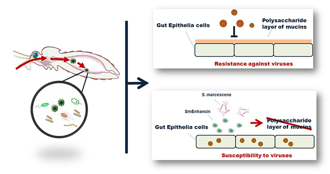 为研究粘质沙雷氏菌辅助登革病毒感染伊蚊的作用机制,研究人员分别研究了粘质沙雷氏菌的菌体固有组分、胞外分泌小分子及蛋白质在辅助病毒感染中的作用,最后发现效应分子在粘质沙雷氏菌的胞外分泌蛋白中。通过进一步分离实验、质谱鉴定以及功能研究,研究人员发现一种细菌分泌蛋白为辅助蚊媒病毒感染作用的关键蛋白,并将其命名为SmEnhancin。进一步研究结果发现,SmEnhancin通过降解蚊虫肠道细胞表面的粘蛋白(Mucin)层从而提高肠道细胞对病毒的易感性。这项研究首次发现了肠道细菌编码的蛋白因子在辅助蚊媒病毒感染中的作用(图2)。