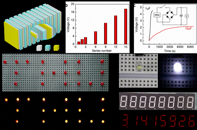 本项研究工作开创性地利用氧化石墨烯作为基础材料,通过激光加工技术实现了材料内部含氧官能团的异质分布,辅助界面设计构建肖特基结进行载流子的运动调控,建立了一种全新的湿气产电器件,实现了湿气扩散直接转化为电能的过程。在湿气刺激下,单个器件(亚厘米尺寸)可以产生高达1.5V的电压(与商用的纽扣电池相当)。此外,通过简单的层层组装进行有效的串联,实现了高达18V的输出电压,能够成功为商用的LED阵列和数码管供电。该工作开发了一种全新的湿气产电器件,为设计高效、高输出的新型能源器件奠定了基础,作为一种新型清洁能源器件,展现出巨大的应用前景。