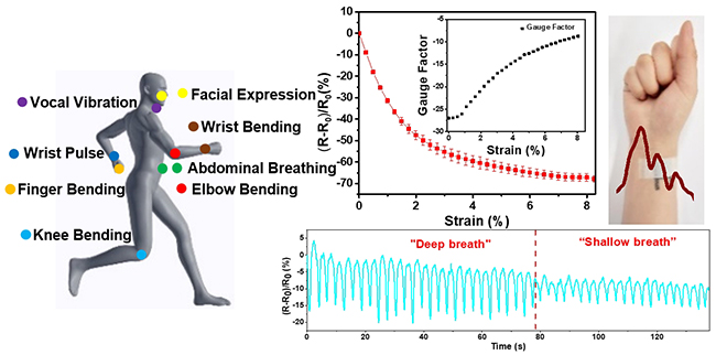 任天令教授团队基于高温还原石墨烯,将石墨烯与织物相结合,不需要传统的高分子聚合物进行塑封,真正实现了器件与衣物的完美融合。通过电阻变化对人体各种运动进行监测。器件经过水洗处理,依然保持较高的稳定性,石墨烯起到“染色剂”的作用,对衣物进行染色,赋予器件优异的性能。该器件在监测人体生理信号方面有着优异的性能,例如脉搏,腹式呼吸,关节运动和面部表情,还能实现对走,跑等走路姿态的监测。