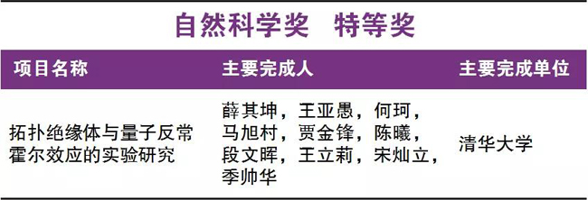 该项目10篇代表性论文中有1篇发表于《科学》(Science),2篇发表于《自然·通讯》(Nature Communications),2 篇发表于《物理评论快报》( Physical Review Letters ),2篇发表于《先进材料》( Advanced Materials ),2篇发表于《物理评论B》(Physical Review B)。量子反常霍尔效应首次实验发现的论文和数据被2016年诺贝尔物理学奖官方介绍作为主要支持实验结果引用。由于这些成果,项目组成员曾获得亚洲磁学联盟奖、何梁何利基金科学与技术成就奖、求是杰出科学家奖、首届未来科学大奖等重要奖励并曾在第156届诺贝尔论坛(Nobel Symposium)等重要国际学术会议做特邀报告。