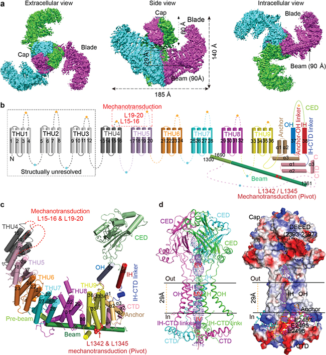 a,Piezo1通道的三聚体冷冻电镜示意图;b,由38次跨膜区组成的Piezo1拓扑结构示意图; c,Piezo1一个亚基细节组成展示图;d, Piezo1成孔区的组成。参与机械力激活Piezo1的胞外loop区以及位于beam上的L1342与L1345位点显示在b及c图。