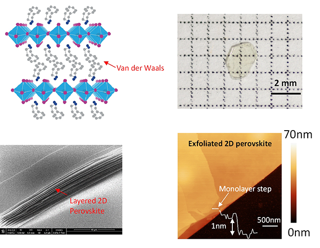 图一. 新型二维钙钛矿单晶及剥离出来的高质量二维钙钛矿单晶薄膜。