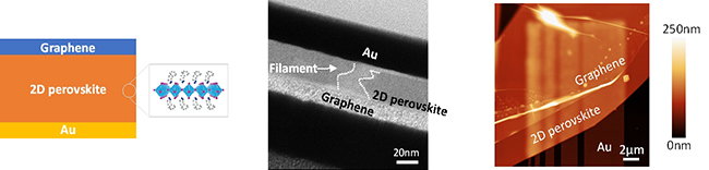 图二. 基于二维钙钛矿的阻变存储器器件结构和观察到的导电细丝。