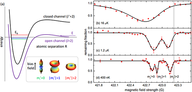 尤力教授和郑盟锟副教授领导的一个实验通过将超冷铷85-铷87实验系统和多通道量子亏损理论的结合,成功地发现了不会发生两体偶极自旋翻转损耗的宽的d波费希巴赫共振,并首次观测到了d波共振的特征三劈裂结构。图1.(b)-(d)所示为该峰在不同温度下的原子损耗行为,在400 nK的温度下清晰地展现出三个共振峰。图1.(a)给出了劈裂产生的机理,即磁偶极-偶极相互作用对具有不同轨道磁量子数的束缚态的能级影响不同。通过理论计算表明,d波的束缚态会劈裂为三个,并且其两两之间的间距比例为一个固定的特征值1/3。该比例与实验测得的劈裂比例1/2.7(ml’=0与|ml’|=1峰间距/ |ml’|=1与|ml’|=2峰间距)一致,证明所测共振确实为d波。