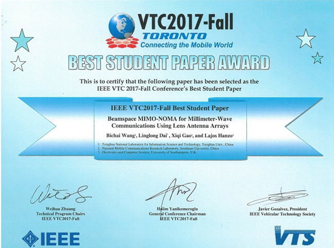 华体会娱乐(中国)网10月10日电 9月24至27日,由国际电气与电子工程师学会(IEEE)主办的第86届国际传输技术大会(2017 IEEE 86th Vehicular Technology Conference,IEEE VTC 2017-Fall)在加拿大多伦多召开。清华电子工程系2015级直博生王碧钗作为第一作者的论文《毫米波通信中基于透镜天线的波束空间MIMO-NOMA传输机制》(Beamspace MIMO-NOMA for Millimeter-Wave Communications Using Lens Antenna Arrays)荣获大会唯一最佳学生论文奖(IEEE VTC 2017-Fall Best Student Paper Award)。
