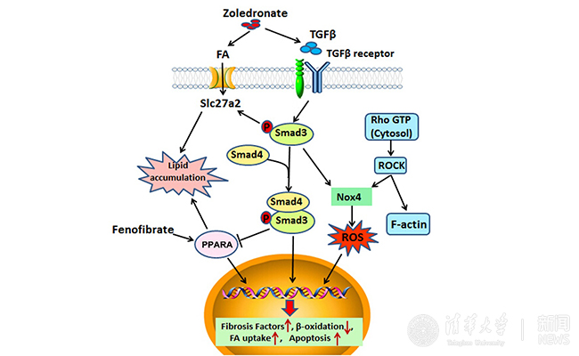 陈立功课题组通过建立唑来膦酸导致细胞、动物毒性模型,系统性利用蛋白组学、代谢组学、分子生物学等技术手段发现,唑来膦酸一方面可以通过激活TGFβ-Smad3信号通路,导致胶原蛋白表达的升高和金属蛋白酶抑制剂合成增加,胶原的肾脏沉积增多,形成肾脏组织纤维化;另一方面通过促进长链脂肪酸转运蛋白SLC27A2表达增加脂肪酸摄取、同时抑制脂肪酸β氧化导致脂质积累,从而对肾组织产生脂毒性,促使肾小管或肾间质细胞去分化,进而促使肾脏纤维化。陈立功课题组通过Slc27a2基因敲除小鼠发现,与野生型小鼠相比,Slc27a2基因敲除小鼠可以明显缓解唑来膦酸导致的肾损伤;另外,研究发现,较之单一使用唑来膦酸组,野生型小鼠同时使用唑来膦酸和过氧化物酶体增殖物激活受体(PPARα) 激动剂非诺贝特组也可以显著缓解唑来膦酸导致的肾损伤,这在一定程度上为唑来膦酸毒副作用的治疗提供了新的思路。
