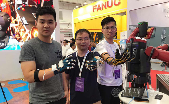 湖南卫视主持人体验通过数据手套控制机器人系统。