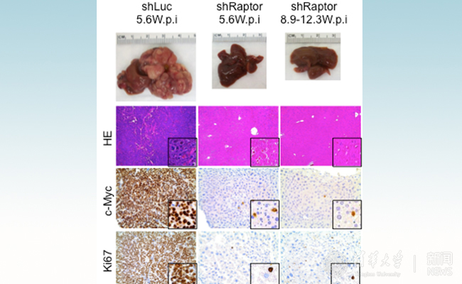 图2:mTORC1信号通路的激活是c-Myc诱导肝癌形成的必要条件。