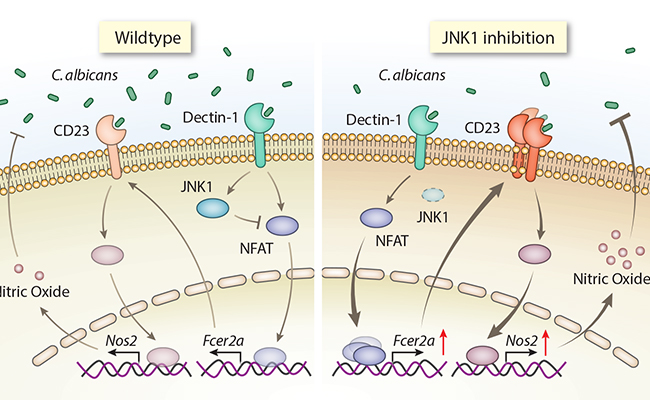 华体会娱乐平台医学院林欣实验室在近日在《自然 医学》杂志上在线发表题为《JNK1通过抑制C型凝集素受体CD23负调控抗真菌天然免疫反应》(JNK1 negatively controls antifungal innate immunity by suppressing CD23 expression)的学术论文中发现,JNK1基因敲除小鼠在临床上最为常见的深部真菌感染、白色念珠菌感染后,其生存率相对于野生型对照小鼠明显增加,同时在野生型小鼠中应用JNK抑制剂后小鼠对于深部真菌感染的生存率也显著增加。其具体机制为,巨噬细胞表面C型凝集素受体Dectin-1识别酵母态的真菌,激活胞内NF-κB、NFAT等信号;当JNK1基因敲除或表达被被抑制情况下,转录因子NFATc1活性增强,NFATc1可结合到C型凝集素受体CD23的启动子区显著上调其表达;高表达的CD23可以识别真菌细胞壁表面成分α甘露聚糖和β葡聚糖,并介导巨噬细胞分泌更多的一氧化氮来杀伤真菌。重要的是,两种JNK抑制剂SP600125和JNK-IN-8在动物模型和细胞水平都显示出了良好的抗真菌感染治疗效果。这些发现首次从分子和动物机体水平明确揭示了JNK1负调控抗真菌感染的作用机制,揭示了JNK1可作为一个潜在的“药物靶点”,通过抑制JNK1的功能来增强机体抗真菌的天然免疫反应用于临床深部真菌感染的治疗。