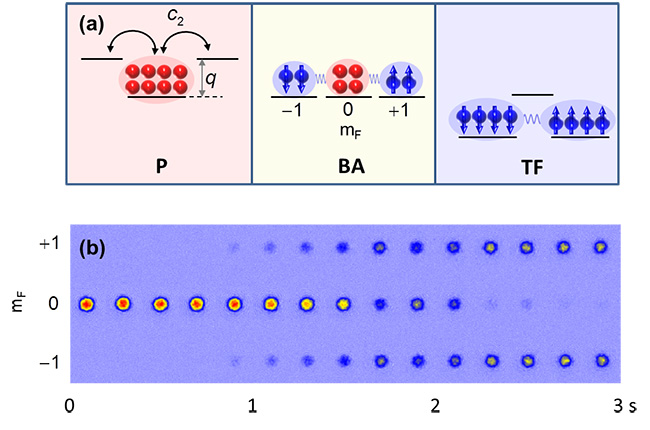 图1 (a) 自旋1的旋量BEC基态取决于单原子内态的二阶塞曼能移(q)和凝聚体中自旋交换相互作用强度(c2)的相对大小,依次出现Polar (P)、Broken-axis symmetry (BA)、和Twin-Fock(TF)相。(b)实验观察到的不同自旋分量的原子吸收成像图,它给出了线性扫描q时BEC在各个内态上的分布随时间的变化。