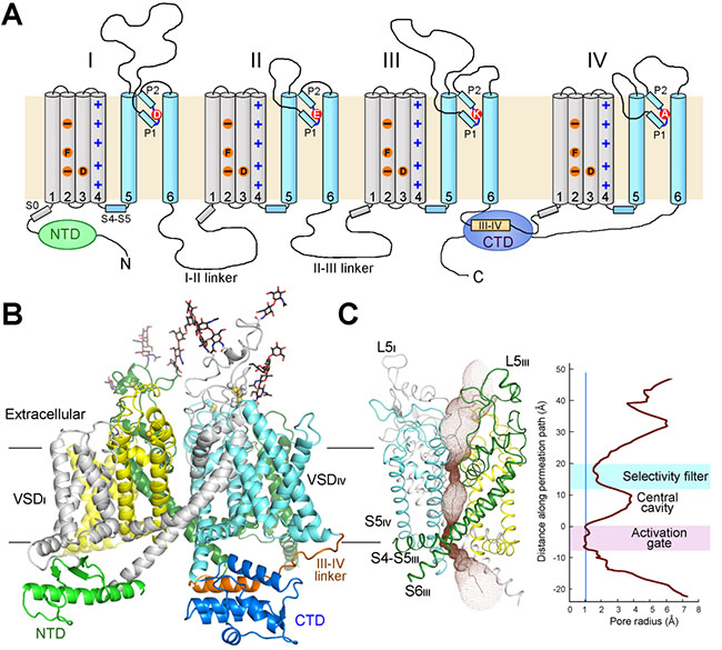真核生物电压门控钠离子通道的拓扑图和三维电镜结构。