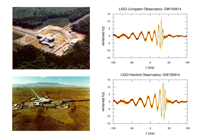 分别位于Livingston和Hanford的LIGO探测器以及它们分别探测到的引力波信号。