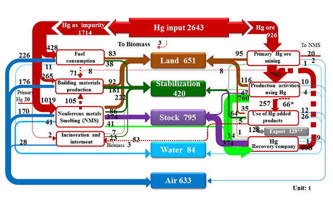 本研究采用物质流分析的方法和多区域投入产出模型进行综合研究。结果表明,中国2010年汞输入量达到2643吨。其中,原生汞矿开采的汞输入量为926吨;由于使用燃煤、有色金属精矿等原料输入的汞量为1714吨;其余来自生物质燃烧。输入的汞主要排放到大气(633 吨)、释放到水体(84 吨)、释放到土地(651 吨)、暂存在固体废物和产品(795 吨)、固化稳定化(420 吨)、随产品出口到其他国家(129 吨)。不同生产活动间的废物和副产品的流动和使用能够减少汞向土地的释放量,但是由此带来102吨大气汞的二次排放。