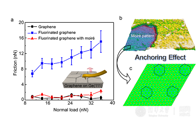 近年来人们发现二维材料由于其特殊的平面原子结构而具有十分奇特而优良的摩擦性能,有望作为一种超薄的润滑材料在微纳领域得到重要应用。然而,由于二维薄膜材料超乎寻常的比表面积,易于受工作环境,特别是表面化学作用影响而降低甚至丧失润滑性能。因此,如何在复杂的滑动工况下从原子尺度上有效地保持单分子层二维材料的稳定性给研究人员提出了一个全新的挑战。华体会娱乐平台摩擦学国家重点实验室以及华体会娱乐平台航天航空学院联合中国科学院上海微系统所信息功能材料国家重点实验室的科研人员观察到锗(111)晶面上生长的多晶石墨烯,由于上下晶体堆叠的方式不同,会同时产生具有周期性莫尔条纹的区域和非莫尔条纹的区域。经过氟化、氧化等化学处理后,非莫尔条纹区域的润滑性能极大削弱。然而,具有周期性莫尔条纹区域的石墨烯却仍然保持良好的润滑特性。通过第一性原理计算,科研人员发现,周期性莫尔条纹区域中石墨烯的碳原子与锗原子之间的相互作用力要远远强于普通的范德瓦尔斯力;这种强的锚定作用使得石墨烯能够抵御外界扰动对其平整分子结构形貌的改变,从而增强其润滑的鲁棒性。相关研究发现有望推广到其它的二维材料体系,推动单分子层润滑材料在微纳系统中的应用。