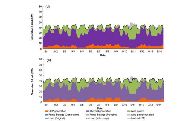 2020年不同发展场景下蒙西电网小时级调度模拟结果。(a)40GW风电装机且无抽水蓄能和电锅炉场景下供暖季模拟结果;(b)40GW风电和2.4GW抽水蓄能但无电锅炉场景下供暖季模拟结果;(c)40GW风电和30%比例的电锅炉但无抽水蓄能场景下供暖季模拟结果;(d)与(a)相同场景下非供暖季模拟结果;(e)与(b)相同场景下非供暖季模拟结果。