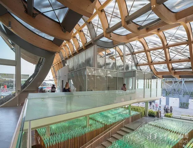 为了实现中国馆屋面轻盈和大跨度的内部展览要求,采用了以胶合木为主材的结构体系。屋面从下而上包括:钢木(胶合木)结构组成的结构屋面、位于结构屋面上的PVC防水层体系、结构梁上穿透防水层衔接遮阳竹板的支撑体系、和参数化设计的竹板遮阳体系--这种“三明治”开放性建构体系,即使在世界范围也是创新的。