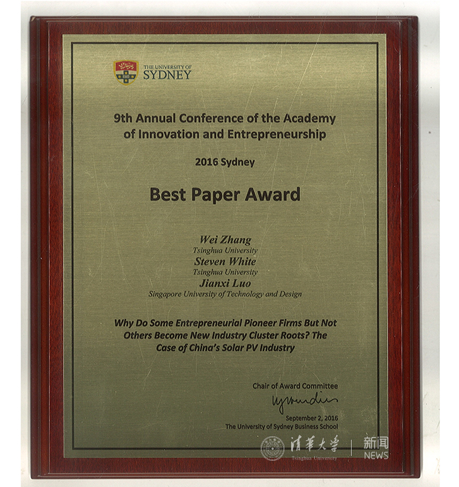 华体会娱乐(中国)网9月19日电 (通讯员 张瑾琳)9月,清华经管学院创新创业与战略系张帏教授、白思迪(Steven White)教授与新加坡科技设计大学罗建曦教授合著的会议论文《为什么某个创业企业而不是其它企业能成为产业集群的根基企业?——基于中国光伏产业的研究》(Why do some entrepreneurial pioneer firms but not others become industry cluster roots? The case of China's solar PV industry)在第九届创新创业国际学术年会(9th Annual Conference of the Academy of Innovation and Entrepreneurship,简称AIE年会)获得唯一的最佳论文奖(Best Paper Award),这是华体会娱乐平台教师首次在AIE年会上获此殊荣。