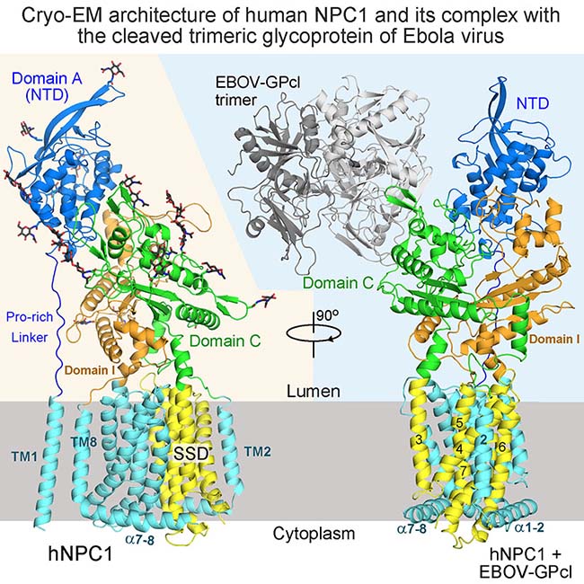 过去几年的研究发现,NPC1除了在细胞内胆固醇转运过程中发挥了重要作用,其作为细胞内的埃博拉病毒受体,在埃博拉病毒入侵过程中也起着了不可或缺的重要作用。埃博拉病毒表面的糖蛋白进入溶酶体后会发生酶切,酶切之后的糖蛋白(GPcl)可以和NPC1蛋白直接相互作用,从而引发病毒与宿主细胞内的膜融合过程。