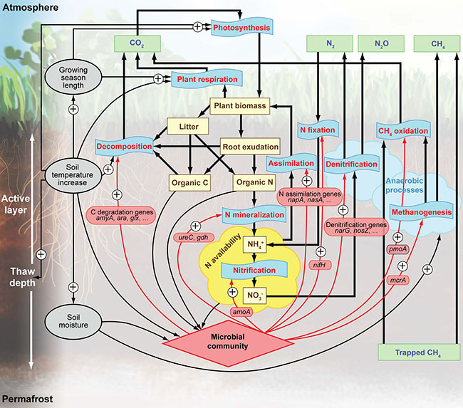 永久冻土带地上、地下生态过程响应气候暖化的机理示意图。