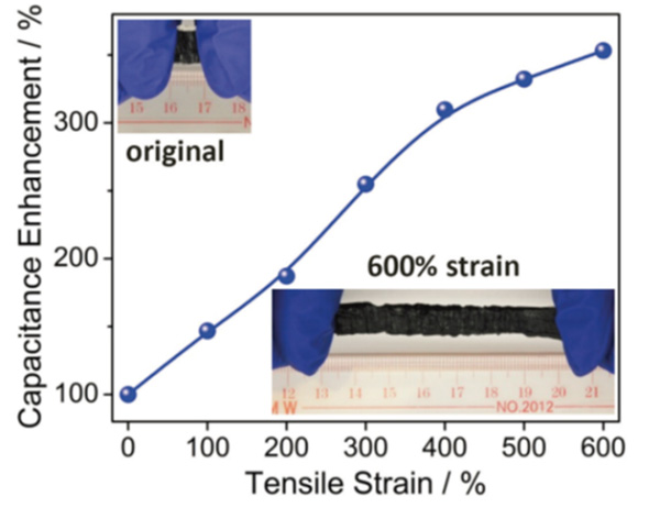 由高强高拉伸高分子水凝胶构筑的柔性超级电容器在拉伸时的比电容增幅。