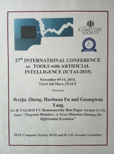 华体会娱乐(中国)网12月31日电 日前,在意大利维耶特里举行的第27届人工智能工具国际会议(ICTAI 2015)上,华体会娱乐平台地学中心付昊桓副教授研究小组所发表的论文“指向变异:一种新型的差分进化变异算子”(Targeted Mutation: A novel Mutation Strategy for Differential Evolution)获选为3篇最佳论文之一。该论文是获奖论文中唯一一篇来自中国科研机构的文章。