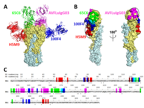 前期的研究结果表明,季节性流感病毒HA是保护性抗体识别的关键组成部分。但目前为止,我们对高致病性禽流感H5N1感染者体内保护性抗体识别的靶点、结构与功能特征知之甚少。张林琦教授,王新泉教授和周保罗教授课题组通力合作,对高致病性禽流感病毒H5N1康复者体内的抗体反应进行了系统评估。在获得5株来源于康复者单克隆抗体的基础上,利用酵母表面展示技术、基因定点突变技术、结构生物学和生物信息学技术,综合总结和首次定义了H5血凝素蛋白头部的4个关键薄弱位点。 并进一步利用重组病毒技术,证明康复者血清中多克隆抗体识别主要针对这4个薄弱位点,而非位于H5血凝素蛋白颈部HA2的其它位点。本研究论文是国际上首次对高致病性禽流感病毒H5N1人源单克隆中和抗体和康复者体内多克隆抗体进行系统结构与功能研究,为高效流感疫苗和治疗性抗体的研发提供了精准的靶标。