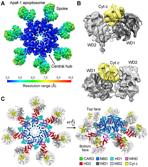(A)Apaf-1凋亡复合体的电子云密度图。凋亡复合体不同区域的表面分辨率由不同颜色表示。中心环状结构的表面分辨率达到3.0–3.5埃。