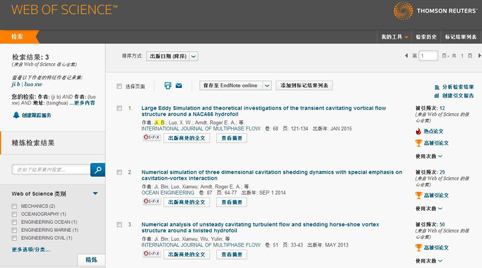 《绕扭曲水翼非定常空化流动的三维大涡模拟及漩涡分析》,发表于《水动力学杂志》,2013年25卷第四期,510-519页。