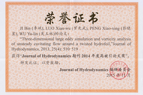Journal of Hydrodynamics期刊2014年度高被引论文奖证书。