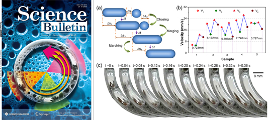 此外,在期刊《Science Bulletin(科学通报)》发表的系列研究中,作者们还先后揭示出了液态金属马达的自驱动宏观布朗运动现象及其固-液界面接触产氢机制(2015-07,图4),以及在轨运行液态金属车辆间的协同运动与无缝连接行为(2015-05,封面文章,图5),包括金属液滴接触融合过程中的动态变形弹簧与弹射现象等(2015-03,图6),揭开了其中的控制因素如表面张力波、电双层效应等。文章第一作者分别有来自医学院的博士生张洁、姚又友和理化所博士生袁彬,通讯作者为刘静教授。