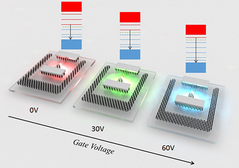 通过栅极电压调控发光波长的机制图。