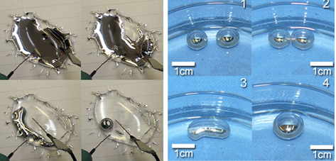 图为电场控制下的液态金属大尺度变形以及液态金属球之间的粘连与融合现象。