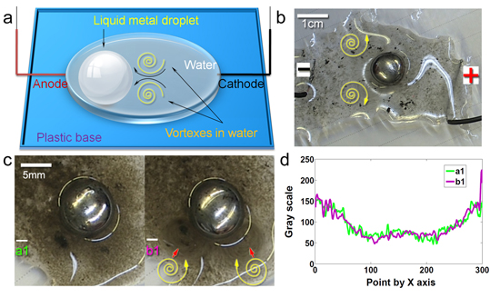 此项工作源于团队长期以来在液态金属领域不断研究推进中的偶然发现,论文通过系统的实验,揭示出室温液态金属具有可在不同形态和运动模式之间转换的普适变形能力。比如,浸没于水中的液态金属对象可在10V左右的低电压作用下呈现出大尺度变形、自旋、定向运动,乃至发生液球之间的自动融合、断裂-再合并等行为,且不受液态金属对象大小的限制;较为独特的是,一块很大的金属液膜可在数秒内即收缩为单颗金属液球,变形过程十分快速,而表面积改变幅度可高达上千倍;此外,在外电场作用下,大量彼此分离的金属液球可发生相互粘连及合并,直至融合成单一的液态金属球;依据于电场控制,液态金属极易实现高速的自旋运动,并在周围水体中诱发出同样处于快速旋转状态下的漩涡对;若适当调整电极和流道,还可将液态金属的运动方式转为单一的快速定向移动。研究表明,造成这些变形与运动的机制之一在于液态金属与水体交界面上的双电层效应。以上丰富的物理学图景革新了人们对于自然界复杂流体、软物质特别是液态金属材料学行为的基本认识。应该说,这些超越常规的物体构象转换能力很难通过传统的刚性材料或流体介质实现,它们事实上成为用以构筑可变形智能机器的基本要素,为可变形体特别是液体机器的设计和制造开辟了全新途径。
