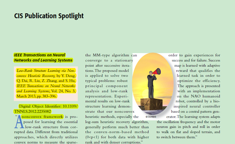 华体会娱乐(中国)网9月17日电 近日,华体会娱乐平台自动化系戴琼海教授课题组于2013年3月在信息处理和智能计算领域国际顶级期刊IEEE神经网络及智能系统会刊(IEEE Transactions on Neural Networks and Learning Systems)发表的题为《非凸启发下的低秩结构感知》(Low Rank Structure Learning via Non-convex Heuristic Recovery)的论文被IEEE神经网络及智能系统会刊选作2013年第一季度的亮点文章。该论文还被IEEE智能计算协会会刊IEEE智能计算杂志(IEEE Computational Intelligence Magazine)在2013年度第二季度的季刊上以智能计算协会亮点(CIS Publication Spotlight)的形式专门撰文推荐。